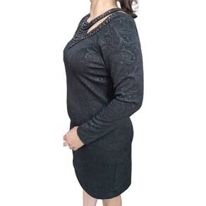 Brilhe com elegância em qualquer ocasião com o Vestido CKM Pedraria Preto Manga Longa Plus Size.