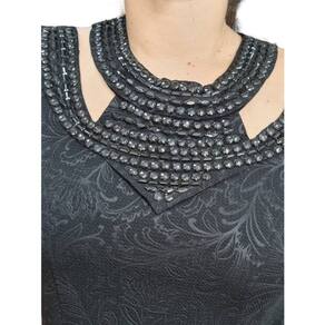 O detalhe em pedraria traz um charme especial ao visual, enquanto a cor preta e o corte clássico alongam a silhueta e valorizam suas curvas com delicadeza.