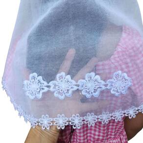 Confeccionado com Filó Verona (75% algodão e 25% poliéster) e Renda Guipir (100% poliéster).