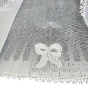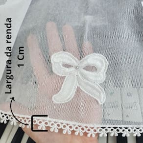 Confeccionado com Filó Verona (75% algodão e 25% poliéster) e Renda Guipir (100% poliéster).