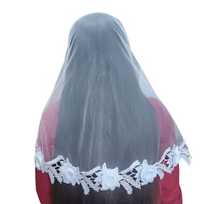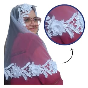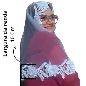 Confeccionado com Tule Francês Transparente (100%poliéster) e Renda Guipir (100% poliéster).