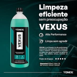 Descrição: Vexus é um limpador de alta performance, desenvolvido especialmente para limpeza de rodas e motores. O produto age na remoção da sujeira sem agredir as rodas e as partes do motor, seja plástico, pintura, borracha ou metal.