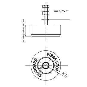 Vibra-Stop STANDARD Antivibratório 1500 KG / 6000 KG Rosca 1/2 POL STD12 VIBRA-STOP Amortecedor de Vibração Vibra-Stop STANDARD - Rosca 1/2 pol Os amortecedores Vibra-Stop atende a necessidade de diminuir a vibração de produtos como compressores, bombas d'água, Serras, entre outros que listamos abaixo em aplicações. Este amortecedor desempenha uma excelente redução nos níveis de vibração e impacto possibilitando o perfeito alinhamento da máquina/equipamento pelo seu exclusivo sistema de nivelamento que compensa, de forma rápida e simples, pequenos desníveis do piso. DADOS TÉCNICOS: Carga estática por peça: 1.500 kg Carga dinâmica por peça: 6.000 kg Diâmetro externo: 115 mm Diâmetro da borracha: 105 mm Altura regulável: 45 - 60 mm Dureza da borracha: 70 shores A Parafuso de ajuste: 1/2 Pol APLICAÇÕES: Compressores; Bomba d'água; Lixadeiras; Limadoras; Serras; Politrizes; Furadeiras; Trituradores; Prensas; Tornos; Fresas; Grupo Geradores; Retíficas; Injetoras; Guilhotinas. Garantia: 12 meses Modelo: STD12 Quantidade: 1 unidade Marca: Vibra-Stop