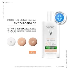 Vichy capital soleil uv-clear 2.0 fps 60 40g Resultado: Fotoproteção diária avançada contra os raios uva, uva longo e uvb Textura aquafluida com acabamento invisível para todos os fototipos Absorção rápida e acabamento matte 12h de controle de antioleosidade Redução de 40% da oleosidade da pele com apenas 8 semanas de uso Eficácia clinicamente comprovada Sugestões de uso: protetor solar facial de uso diário com ação antioleosidade e textura aqua-fluida. Itens inclusos:1 protetor solar facial vichy capital soleil uv-clear 2.0 fps 60 40g Marca: Não Informado