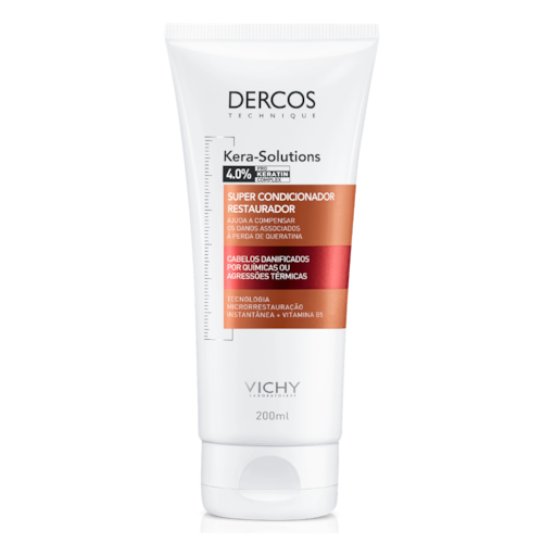 Vichy Condicionador Dercos Kera Solutions É um tratamento restaurador, desenvolvido para compensar os danos associados à perda de queratina, reduzindo 63% dos danos nos fios no 1o uso*. Kera-Solutions age de forma precisa, recuperando as áreas mais porosas e danificadas dos cabelos, graças à sua tecnologia de microrrestauração instantânea, que associa PRO KERATIN COMPLEX em concentrações ideais [4,0%] + ingredientes dermatológicos.