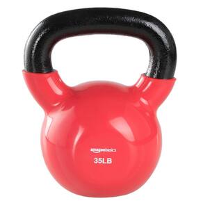Amazon Basics Kettlebell de vinil, 16 kg, vermelho - Kettlebell para exercícios de fitness, incluindo treinamento de agilidade, cardio, resistência, agachamentos, pulmões e muito mais - Inclui um kettlebell de 16 kg feito de ferro para resistência duradoura; peso claramente impresso em cada lado - O revestimento de vinil vermelho mostra o peso num relance, além de proteger o piso, reduz o ruído e evita a corrosão - A alça larga texturizada, suavemente curvada, ajuda a garantir uma aderência confortável e segura; segure com uma ou duas mãos - Dimensões do produto: 20,6 x 14,5 x 25,4 cm (CxLxA)