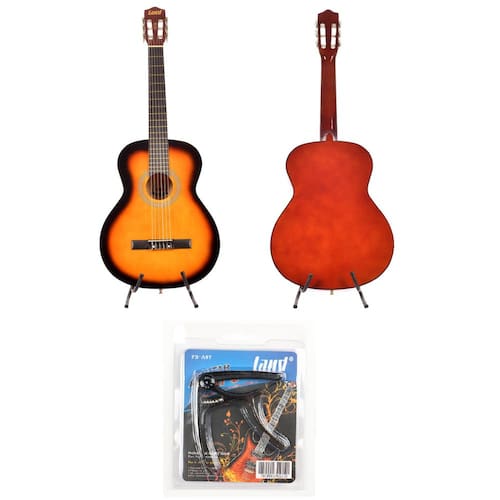 Violão land acustico nylon sunburst ln-39 sb A land sabe que mesmo os iniciantes merecem um primeiro violão com qualidade e o la39, com cordas de nylon, é uma ótima opção neste caso. Violão ideal para quem está começando os primeiros passos no mundo da música. Oferece som acústico, marcações na sua escala que facilitam a visualização do estudante. O violão de aço ln-39 da land é sucesso de venda, isso se deve a sua ótima qualidade, tanto sonora quanto de acabamento, aliada ao seu baixo custo. O ln-39 é um dos violões mais indicados pelas escolas de música para iniciantes e estudantes. Exatamente por ser um violão macio, leve e conta com cordas de nylon, que proporcionam uma pegada mais confortável, facilitando o aprendizado. O ln-39 é excelente também para quem quer reunir seus amigos, fazer uma roda e tocar suas músicas favoritas. Marca - land Modelo - la39 Linha - water series Categoria - iniciante Estilo - cowboy Tamanho - 39 polegadas Tampo - linden Fundo - linden Escala - black wood Braço - mahogany Acabamento - verniz brilhante Cor - sunburst Cordas - nylon Cavalete - black wood Cutway - sim Trastes - 20 Marcaçao - bolinhas brancas Comprimento - 98,8 cm Largura - 38,0 cm Espessura - 10,0 cm Braço - 52,2mm Peso - 1,65 kg + capo traste pb a07 - muitas vezes o processo criativo de uma música necessita de algum auxiliar que deixe o arranjo mais completo e bonito. E o capotraste é um objeto musical fundamental para isso e quando falamos nele, a land é especialista na área e hoje iremos te apresentar o capotraste land pb-a07 para violão de aço 6 cordas. O land pb-a07, é um excelente item de acompanhamento, feito em material resistente, o que faz ele prender as cordas com maior precisão, assim você pode substituir a tonalidade da música sem dificuldades e sem mudar as formas de acordes já aprendidos, deixando o som do violão mais limpo e brilhante