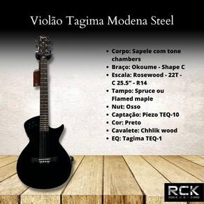 Características: Violão Tagima Modena 1 Aço Preto Corpo: Sapele com tone chambers Braço: Okoume - Shape C Escala: Rosewood - 22T - C 25.5 - R14 Tampo: Spruce ou Flamed maple Nut: Osso Captação: Piezo TEQ-10 Cor: Preto Cavalete: Chhlik wood EQ: Tagima TEQ-1 Marca: Não Informado