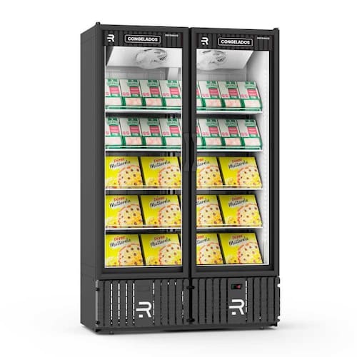 - Temperatura: -18C; - Refrigeração: Ar forçado; - Controlador digital de temperatura; - Iluminação em LED no teto; - Porta de vidro duplo, temperado, com aquecimento. Sistema de abertura pivotante com fechamento automático; - Gabinete interno branco e externo preto em chapa galvanizada pintada; - Prateleiras tipo aramado com regulagem de altura; - Entrada de ar inferior em PSAI vaccum forming; - Pés com regulagem de altura.