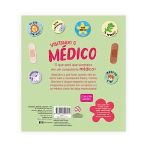 O que será que acontece em um consultório médico? Descubra o que fazer quando não se sentir bem e acompanhe Pedro, Camila, Giovana e Isaque enquanto os quatro amiguinhos precisam ser corajosos e ir ao médico tratar de seus machucados! Com adesivos fofos e que imitam curativos para incentivar a coragem dos pequenos na visita ao médico!