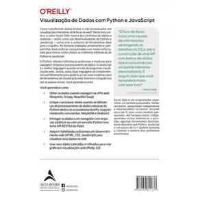 Visualização de Dados com Python e JavaScript Como transformar dados brutos e não processados em visualizações interativas dinâmicas na web? Neste livro prático, o autor Kyran Dale mostra aos cientistas de dados e analistas — assim como aos desenvolvedores de Python e JavaScript — como criar o conjunto de ferramentas ideal para o trabalho. Ao fornecer exemplos envolventes e compartilhar boas práticas conquistadas com muito esforço, este guia ensina como utilizar as melhores bibliotecas de Python e JavaScript. O Python oferece bibliotecas poderosas e maduras para raspagem, limpeza e processamento de dados. O JavaScript é a melhor linguagem quando se trata de programar visualizações web. Juntas, essas duas linguagens se complementam perfeitamente para ajudá-lo a criar uma moderna caixa de ferramentas de visualização web. Este livro vai ajudá-lo a dar os passos iniciais. Você aprenderá como: Você aprenderá como: • Obter os dados usando raspagem ou APIs web (Requests, Scrapy, Beautiful Soup) • Limpar e processar dados usando as bibliotecas de processamento de dados robustas do Python dentro do ecossistema NumPy (Jupyter notebooks com pandas, Matplotlib e Seaborn) • Entregar os dados a um navegador com arquivos estáticos ou com um servidor Python leve (uma API RESTful do Flask) • Adquirir habilidades suficientes em desenvolvimento web (HTML, CSS, JavaScript) para visualizar seus dados na web • Usar seus dados coletados e refinados para criar gráficos e visualizações web (Plotly, D3) “O livro de Kyran inclui uma riqueza de informações, abrangendo os detalhes do D3.js até a construção de uma API com banco de dados que é consumida por um painel interativo personalizado. É seguro dizer que você aprenderá muito com este livro!” — Peter Cook, autor de D3 Start to Finish