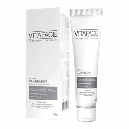 Vitaface Gel Creme Clareador 40g DESCRIÇÃO:VITAFACE CLAREADOR é um produto inovador, adequado para clareamento da pele, do rosto e corpo, prevenindo o surgimento de alterações de pigmentação e clareando aquelas já existentes, até mesmo quando provocadas pelos raios solares. Além de iluminar e uniformizar o tom da pele, contém ativos que atuam como antissinais auxiliando também no rejuvenescimento da mesma. Possui um sistema multicorretivo com a exclusiva nanocápsula NANO XR 4 combinada com ingredientes biotecnológicos e extratos naturais. Atua na formação e distribuição da melanina, proporcionando resultados visíveis e comprovados de alta performance em até 4 semanas de uso. Formulação eficaz, segura e confortável.AÇÃO/ATIVOS:Dióxido de titânio ou óxido de zinco MODO DE USAR:Aplicar duas camadas do produto em todo o corpo ou uma colher de chá para rosto, cabeça e pescoço; duas colheres de chá para frente e trás do torso; uma colher de chá para cada braçoESTE ANÚNCIO CONTÉM: 01 UNIDADE DE VITAFACE GEL CREME CLAREADOR 40GVitaface Gel Creme Clareador 40g