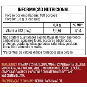 Vitamina b12 máxima concentração 180 cápsulas - nutrione Vitamina b12 máxima concentração nutrione - 180 cápsulas A vitamina b12 máxima concentração nutrione é essencial para a saúde neurológica e energética, fornecendo uma dose poderosa de 9,94mcg de vitamina b12 por cápsula. Com 180 cápsulas por pote, nosso produto é formulado para otimizar seus benefícios à saúde. Benefícios: Suporte à saúde neurológica Aumento dos níveis de energia Melhora do desempenho cognitivo Auxílio na formação de glóbulos vermelhos Contribuição para a saúde cardiovascular Redução do oxidativo Reforço significativo da imunidade Vantagens: Tecnologia de fabricação avançada Fórmula sem glúten Alta concentração de 9,94mcg de vitamina b12 por cápsula Potência superior no mercado de 180 cápsulas por pote Comprando hoje ganhe gratuitamente um porta comprimidos da nutrione, para manter seus comprimidos seguros, bem acondicionados e organizados. Conte também com nosso serviço de atendimento ao consumidor dedicado: Suporte ao cliente todos os dias da semana exclusiva nutrione você totalmente satisfeito com o nossa vitamina b12 ou seu dinheiro de volta Ingredientes com a melhor qualidade do mercado, inspecionados e fabricados rigorosamente de acordo com as normas da anvisa Marca: Não Informado