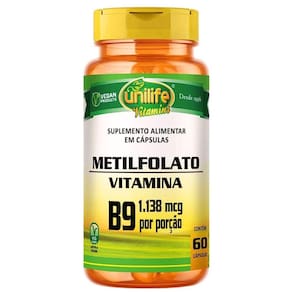 Suplemento Vegano de Vitamina B9 Metilfolato 60 cápsulas de 350mg A Unilife é uma empresa brasileira especializada em suplementos alimentares, focada em oferecer produtos de alta qualidade para promover a saúde e o bem-estar dos clientes. Ingredientes: L-metilfolato de cálcio, agente de massa celulose e antiumectantes dióxido de silício e estearato de magnésio. Cápsula: Gelatina vegetal e água purificada. Peso total da cápsula: 350 mg Sugestão de Consumo: Sugere-se a ingestão de 2 cápsulas ao dia após a refeição. Ingerir com líquido. Indicado para maiores de 19 anos. Não contém glúten. Livre de lactose. Produto Vegano. Produto autorizado para comercialização em todo o território nacional através do anexo I da RDC 240/2018 da ANVISA. AFE do MS 6.02234-1. Marca: Não Informado