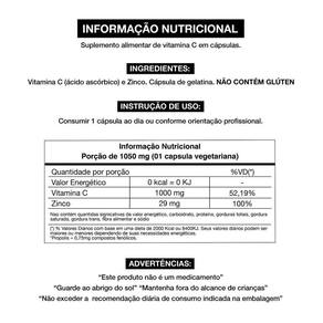 Sugestão de uso: Consumir uma cápsula por dia ou conforme orientação profissional. Ingredientes: vitamina C ácido ascórbico e Zinco. Cápsula de gelatina.