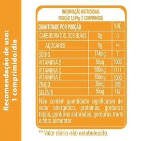 Suplemento alimentar de Vitamina D3 em comprimidos revestidos. Possui 2.000UI de Vitamina D que auxilia no funcionamento do sistema imune e muscular. Indicado como suplemento vítaminico em dietas restritivas e inadequedas. Com vitamina C, selênio e Zinco.