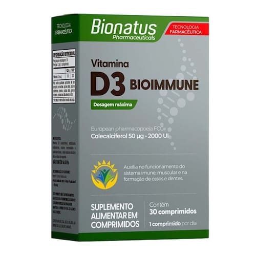 Auxilia na manutenção da imunidade; Importante para regular cálcio e fósforo, fixando o cálcio no osso; Participa do processo de divisão celular; Auxílio no funcionamento muscular; PRINCIPAIS MOLÉCULAS: Colecalciferol 2.000 UI Apenas 1 comprimido por dia USO ORAL USO ADULTO Contém 30 comprimidos