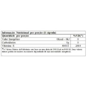Suplemento de Vitamina E em cápsulas. Apresentação: 60 cápsulas. A vitamina E é um antioxidante que auxilia na proteção dos danos causados pelos radicais livres. Recomendação de consumo: Sugere-se 1 cápsula ao dia durante a principal refeição do indivíduo. Fabricado nos Estados Unidos. Reg. M.S.: Produto Isento da Obrigatoriedade de Registro conforme RDC 27/2010. Marca: Não Informado