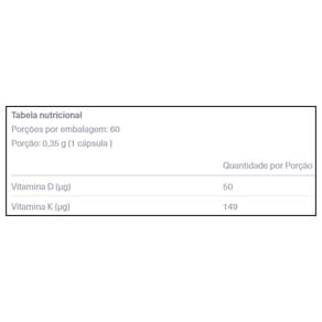 A vitamina D é fundamental para a saúde, com 80% a 90% sendo produzida pelo corpo ao ser exposta aos raios UVB do sol, que estimulam a síntese de colecalciferol D3 . Apesar da abundância de sol no Brasil, a população apresenta altas taxas de falta de vitamina D, devido a fatores como pouca exposição solar e baixo consumo de alimentos ricos em vitamina D. A vitamina K2 é uma vitamina lipossolúvel, também conhecida como vitamina da beleza por conta de seus benefícios importantíssimos ao transporte do cálcio pelo transportador magnésio. A vitamina K2 auxilia para que esse cálcio não seja acumulado em outras partes do nosso corpo e sim, seja espalhado de formas iguais. Além disso, contém a biodisponibilidade da MK-7 menaquinona-7 , que trabalha a favor de uma absorção e permanência da vitamina por mais tempo. Benefícios: Pode atuar na modelagem da estrutura de suporte do corpo. Pode atuar na qualidade dos dentes. Pode atuar para uma harmonia durante o crescimento. Proporções exatas e equilibradas dos minerais essenciais. Bem-estar da pele. Otimiza a absorção e fixação do cálcio. A vitamina D3 ajuda a absorver o cálcio e o fósforo dos alimentos e a vitamina K2 ajuda a direcionar esse cálcio para onde é necessário; A vitamina D3 pode desempenhar um papel na saúde da mente; A vitamina D3 também participa da produção de queratina, uma proteína que ajuda a proteger e manter a hidratação da pele e dos cabelos. Sugestão de Uso: Sugere-se a ingestão de 1 cápsula ao dia ou conforme recomendação . Marca: Não Informado