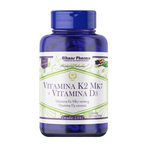 Vitamina K2 MK7 é a forma mais biodisponível e mais bioativa da vitamina K. A vitamina K é essencial para formação e reparo ósseo saudáveis; faz parte da síntese da osteocalcina, a proteína no tecido ósseo usada na cristalização do cálcio. À medida que a vitamina K ajuda a desenvolver os ossos, também inibe a calcificação dos vasos sanguíneos. Esta função de transporte de cálcio remove, assim, os depósitos de cálcio dos vasos, onde não são necessários, e trabalhando junto com a vitamina D, aumenta os depósitos de cálcio nos ossos, onde o cálcio é mais necessário.BENEFÍCIOS:- Fortalecimentos dos ossos;- Regulação dos níveis de cálcio nos ossos e nas artérias;COMPOSIÇÃO:Vitamina K2 Mk7 100mcgVit D3 10.000 UiExcipiente qsp 1 cápsulaSUGESTÃO DE USO: Tomar 1 cápsula ao dia.As fotos são ilustrativas e a embalagem enviada é a da farmácia. O produto vai lacradoAs matérias - primas são todas com laudo de qualidade + nota fiscal.Somos uma empresa desde 1947. Tradição, qualidade e confiança são nosso Lema.