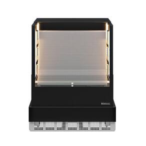 Conservação e exposição de bolos, tortas, doces e confeitos ou bebidas, frios e laticínios Temperatura: Bolos: +5°C a +10°C / Bebidas: +3° a +8°C Refrigeração: Ar Forçado Iluminação: LED perimetral com interruptor Laterais em vidro duplo Low-E (baixo emissivos), com serigrafia Tampo em vidro temperado com serigrafia Prateleiras reguláveis em vidro temperado: 2 níveis Cortina noturna Base acoplada em aço pré-pintado preto, com passagem de ar em aço revestido aço inox 304 escovado Pés niveladores e rodízios giratórios Vidros sujeitos a condensação da umidade do ar Equipamento necessita de instalação hidráulica para escoamento da água proveniente do degelO