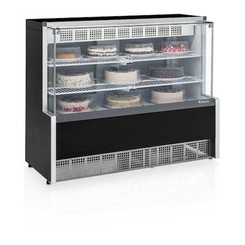 Vitrine Refrigerada Confeitaria Linha Aurora Dupla Função GPEA140R Gelopar. Vitrine Refrigerada Confeitaria Dupla Função. Conservação e Exposição de bolos, tortas, doces e confeitos. Conservação e Exposição de bebidas, frios e laticínios. Refrigeração: Estática com evaporador aletado. Temperatura: Bolos: +5C a +10C. Bebidas: 0 a +7C. Degelo: Manual. Controle de Temperatura: Termostato. Revestimento Externo: Gabinete: Monobloco em aço pré-pintado. Iluminação LED (interna), com interruptor. Porta(s) injetada(s) em PSAI. Prateleiras: 2 níveis, aramadas. Pés niveladores. Vidros temperados sujeitos a condensação da umidade do ar. Recomendável embalagem com cúpula para proteção dos bolos, pois poderá haver gotejamento da condensação da chapa do evaporador. TEMPERATURA: bolos +5°C a +7°C /bebidas 0°C a +7°C. PESO: 77 Kg. CONSUMO: 5,72 kWh/dia. DIMENSÕES EXTERNAS (CxAxL): 140x115x63,2cm. Equipamento certificado conforme Portaria Inmetro nº 371/2009. Vitrine Refrigerada Confeitaria Linha Aurora Dupla Função GPEA140R Gelopar é na Atau.