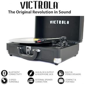 LEVE SUAS MÚSICAS PARA QUALQUER LUGAR Alojado em uma mala vintage com uma alça de transporte fácil, a mistura de design retrô e contemporâneo da Victrola oferece a máxima flexibilidade para ouvir música onde você quiser e como quiser uma ótima opção para os amantes de vinil