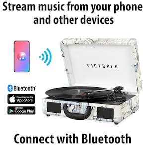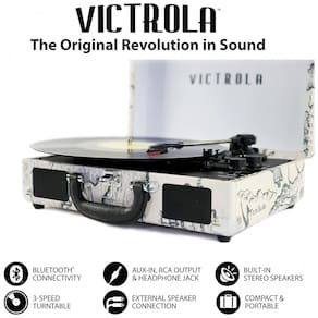 MESA GIRATÓRIA ACIONADA POR CORREIA DE TRÊS VELOCIDADES Este toca discos de mala de 3 velocidades 33 1, 3, 45, 78 rpm apresenta QUALIDADE DE SOM PREMIUM ATUALIZADA e fica em pés de isolamento de som que evitam vibrações. É perfeito para sua sala de estar, quarto ou escritório LEVE SUAS MÚSICAS PARA QUALQUER LUGAR Alojado em uma mala vintage com uma alça de transporte fácil, a mistura de design retrô e contemporâneo da Victrola oferece a você a máxima flexibilidade para ouvir música onde quiser e como quiser uma ótima opção para os amantes de vinil OPÇÕES DE CONEXÃO EXPANDIDA Transmita o áudio do smartphone através dos alto falantes Bluetooth integrados do toca discos. Conecte facilmente alto falantes externos através das saídas RCA estéreo ou use a entrada Line para dispositivos não Bluetooth, como um CD player. Para audição pessoal, conecte seus fones de ouvido à entrada de fone de ouvido NENHUM SISTEMA ESTÉREO OU EQUIPAMENTO EXTRA NECESSÁRIO. Coloque o em funcionamento em minutos. A aparência retrô combinada com a conveniência da tecnologia moderna torna este toca discos acessível ideal para iniciantes e entusiastas do vintage