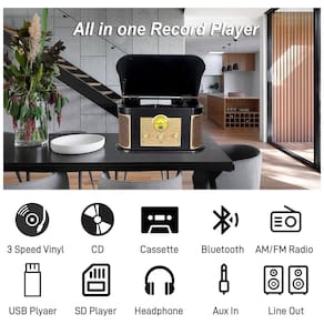 8 em 1 ENTERTAINMENT CENTER Este toca discos não apenas reproduz seus Vinis, mas também CD e cassete, rádio FM e dispositivo USB. Também pode gravar conteúdo de áudio em discos de vinil em seu dispositivo USB. Este toca discos pode reproduzir sons em seus outros dispositivos através de Bluetooth.