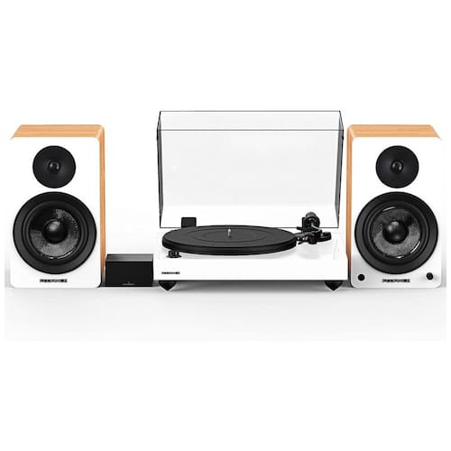 DESEMPENHO DE SOM EXCEPCIONAL Saboreie a melhor experiência de audição combinando um toca discos de alta fidelidade totalmente carregado com alto falantes de prateleira de 120 watts infinitamente versáteis e que enchem a sala.