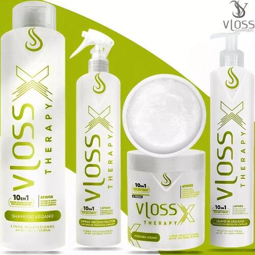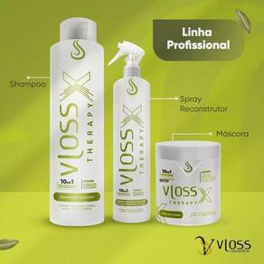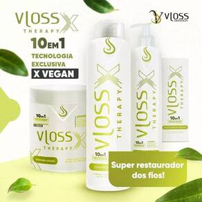 ATENÇÃOA Linha Vloss X Therapy é um tratamento multifuncional composto por óleo de coco, óleo de linhaça, óleo de semente de uva, manteiga de murumuru e manteiga de karité, que são excelentes emolientes naturais que proporcionam uma hidratação profunda nos fios, mantendo uma leveza surpreendente. Seus ativos são capazes de levar até a camada interna da fibra vitaminas e peptídeos que reparam os danos e nutrem profundamente de dentro para fora.O que você irá receber:Shampoo Vegano: 1 LMáscara 10 Em 1 Vegano: 500gSpray Reconstrutor: 300 MlLeave In Vegano: 300 Ml