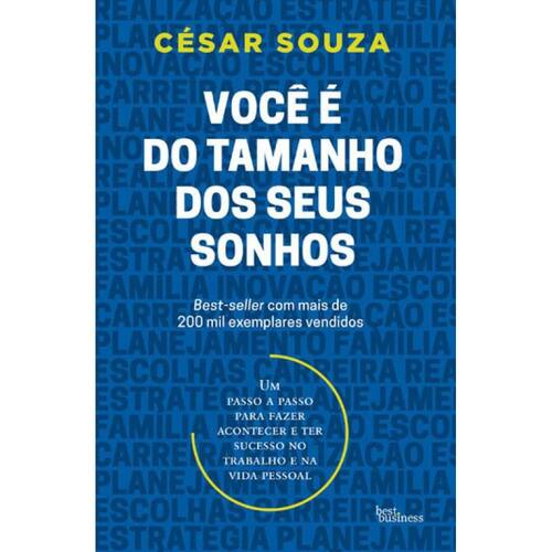 A nova edição do best seller com mais de 200 mil exemplares vendidos Todos nós sonhamos com uma vida tranquila, encontrar um amor, ter filhos, e garantir um futuro melhor para eles, obter sucesso na profissão, ganhar dinheiro, comprar a casa própria, viajar, identificar uma motivação social, ter saúde e amigos. Mas, na maioria das vezes, nos entregamos à rotina, nos rendemos aos obstáculos e desistimos dos nossos sonhos, ou projetos de vida. Você é do tamanho dos seus sonhos ajuda o leitor a resgatar a capacidade de sonhar e empreender mudanças objetivas para realizar suas metas. César Souza apresenta um passo a passo para tirar os sonhos da cabeça, colocá-los no papel e torná-los realidade. A obra reúne histórias de mais de 50 realizadores de sonhos de todas as regiões do país: grandes empresários, pequenos e médios empreendedores, líderes do terceiro setor, celebridades e pessoas comuns. São relatos que nos revelam como várias empresas e iniciativas vencedoras nasceram dos sonhos íntimos de seus idealizadores. Neste passo a passo para fazer acontecer e ter sucesso, César Souza desafia o leitor a acreditar no seu potencial e a buscar recursos e aliados para concretizar os seus sonhos.