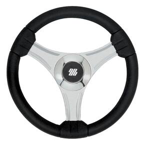 Tavolara - Volante de poliuretano preto de 13,8" com raios prateados e cubo X62 Este volante Uflex Tavolara é um volante de barco de 3 raios