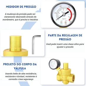 Vrp tk- 905 valvula redutora pressao latao com manometro dn 1.1/4pol Válvula redutora para agua x000d Regulagem de 1 a 16 bar 250 psi x000d Corpo em latão hpb57-3 x000d Extremidades rosca gás bsp ff x000d Saída para manômetro flp 1/4 manômetro incluído x000d Compatível com água x000d Temperatura de trabalho de -10ºc a 110ºc. x000d Pressão máxima de trabalho 10 bar pn16 . x000d A válvula redutora de latão usa as peças de abertura e fechamento da válvula para ajustar o fluxo do meio, reduzir a pressão do meio e, ao mesmo tempo, ajustar a abertura da válvula pela pressão atrás da válvula, de modo que a pressão final seja mantida dentro de uma determinada faixa. no caso de alterações constantes na pressão de entrada, a pressão de saída é mantida dentro da faixa definida para proteger os aparelhos residenciais e de produção subsequentes. x000d Função - regulação , descompressão x000d Aplicação - a válvula redutora só pode ser utilizada para a descompressão de gás limpo ou água como ar, vapor, água, que não contenha impurezas particuladas. se necessário, um filtro pode ser instalado antes da válvula redutora . Marca: Não Informado