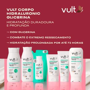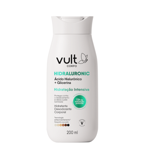 O Hidratante Desodorante Corporal Vult Corpo Hidraluronic Hidratação Intensiva proporciona hidratação para o corpo ao combinar Ácido Hialurônico e Glicerina: dois ativos reconhecidos pelo alto poder de hidratação para um cuidado intensivo com a pele.