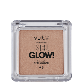 Iluminador em pó compacto. Vult Meu Glow! tem um brilho duradouro com alta fixação, efeito espelhado e um toque aveludado na pele.
