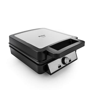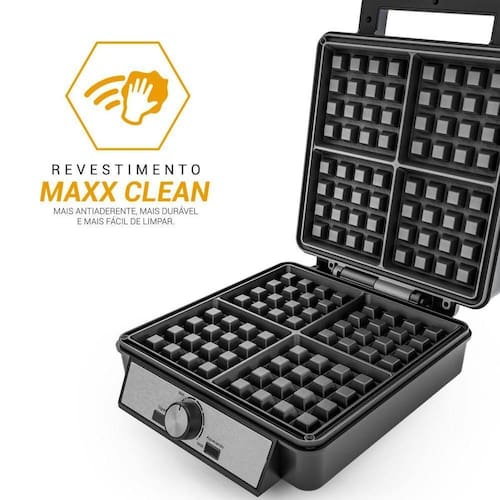 Waffle Maker Philco para 4 waffles grandes, com seletor de 5 temperaturas, placas antiaderentes de 25x25cm com revestimento Maxx Clean, base antiderrapante e acabamento em inox.Porta-fio