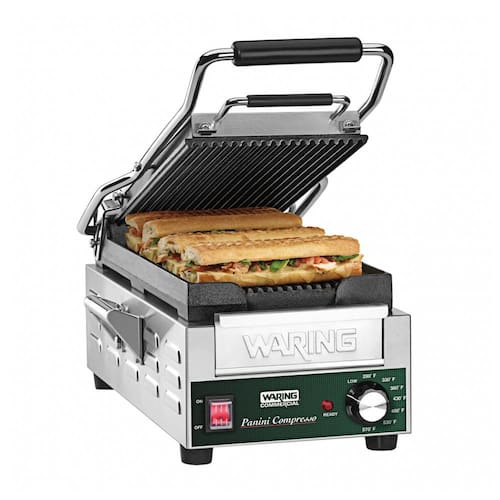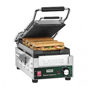 Placas em ferro fundido com ranhuras para escoamento de óleos. Termostato ajustável até 299°C. Bandeja de gotejamento removível. Corpo em aço inoxidável escovado. Inclui escova de limpeza.Funciona como grill