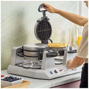 A Waring WW300BX é uma máquina de waffles belga elétrica dupla com 4 moldes independentes (grid double), projetada para produção de até 120 waffles belgas de 1 polegada (2,5 cm) de espessura por hora. Indicada para cozinhas de alto volume como cafés e buffets continentais, com elementos de aquecimento embutidos e rotação para cozimento uniforme.