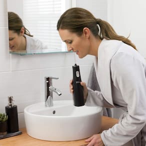 Fio dental sem fio Waterpik, operado por bateria e portátil para viagens e casa, Cordless Express aceito pela ADA, preto WF-02 - FIO DENTAL DE ÁGUA PORTÁTIL OPERADO POR BATERIA: O fio dental Waterpik Cordless Express é alimentado por 3 pilhas AA e foi projetado para viajar para qualquer lugar, usar no chuveiro e em banheiros pequenos. - SEM TOMADAS, SEM CARREGAMENTO: Inclui 3 pilhas AA substituíveis (sem necessidade de tomadas ou carregamento) - supondo o uso uma vez por dia, substitua as baterias a cada 1 a 2 meses, dependendo da qualidade das baterias. - RECOMENDADO PELO DENTISTA: 9 em cada 10 profissionais de odontologia recomendam a marca Waterpik. A Waterpik é clinicamente comprovada e é a primeira marca de fio dental aquático a receber o selo de aceitação da American Dental Association (ADA). - CARACTERÍSTICAS PRINCIPAIS: 2 pontas de uso do fio dental, 2 configurações de pressão (45-75 PSI), reservatório removível de 5 onças (lavável na máquina de lavar louça para facilitar a limpeza), 30 segundos de tempo de uso do fio dental, 3 pilhas AA substituíveis, seguras para uso no chuveiro. - FÁCIL E EFICAZ: O fio dental Waterpik Cordless Express remove até 99,9% da placa e é até 50% mais eficaz do que o fio dental para melhorar a saúde das gengivas. Basta encher o reservatório com água morna, colocar a ponta na boca e começar a usar fio dental. - GARANTIA E SUPORTE: Apoiado por uma garantia limitada do fabricante de 1 ano, consulte o manual para obter detalhes. A equipe de suporte da Waterpik no Colorado está disponível para ajudar com qualquer dúvida ou necessidade do produto.