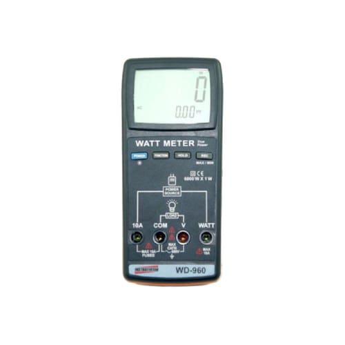 WATTÍMETRO DIGITAL CAT III, TRUE RMS, PARA MEDIÇÃO DE POTÊNCIA ATIVA, CORRENTE AC, TENSÃO AC E FATOR DE POTÊNCIA MOD. WD-960 DESCRIÇÃO: O Wattímetro digital modelo WD-960 se trata de uma ferramenta precisa que possibilita a medição de grandezas elétricas (VAC, ACA, PF e W) de uma forma simples a prática, a carga a ser medida pode ser conectada diretamente em seus bornes. DESTAQUES: True RMS, saídas de dados para conexão com PC, possibilita a conexão da carga diretamente no borne, categoria de segurança: CAT III 600V, memoriza as medições máximas e mínimas e permite congelamento de tela (HOLD). APLICAÇÕES: Medição de potência das mais diversas cargas como: lâmpadas, reatores, eletrodomésticos, motores monofásicos e bifásicos, chuveiro, torneira elétrica, ferramentas elétricas, entre outros. ESPECIFICAÇÕES TÉCNICAS: Display LCD duplo de 9999 contagens de 21,8 x 8,5mm, retroiluminado. Medição de potência ativa (W): Faixa de medição: 1 W a 6000 W Resolução: 1 W Precisão: ± (1% + 5W) Medição de tensão alternada (VAC): Faixa de medição: 0,1 V a 600,0 V Resolução: 0,1 V Precisão: ± (0,3% + 0,3 V) Medição de corrente alternada (ACA): Faixa de medição: 0,01 A a 10,00 A Resolução: 0,01 A Precisão: ± (0,3% + 0,03 A) Medição do fator de potência (PF): Faixa de medição: 0,01 PF a 1,00 PF Resolução: 0,01 PF Precisão: ± (1% + 2 dígitos) Medição RMS em tempo real de ACV / ACA. Gravação de memória (Máx., Mín.) Retenção de dados: Congela a leitura do mostrador (HOLD) Saída de dados para o PC Indicador de bateria fraca. Luz de fundo verde de fácil leitura. Circuito LSI microprocessado Ajuste de zero automático Indicador de sobre escala Tempo de amostragem: Aproximadamente 1 segundo Temperatura de operação: 0ºC a 50ºC (32ºF a 122ºF) Umidade de operação: Inferior a 80 % UR Alimentação: Bateria de 9V tipo alcalina ou adaptador 9V (Opcional) Consumo de energia: Aproximadamente DC 10 mA Peso: 398 g. Dimensões: 190 x 88 x 40 mm (7,5 x 3,5 x 1,6 pol) ITENS FORNECIDOS: Cartão com instruções do Download do manual virtual Pontas de teste (vermelho e preto) Bateria 9 V