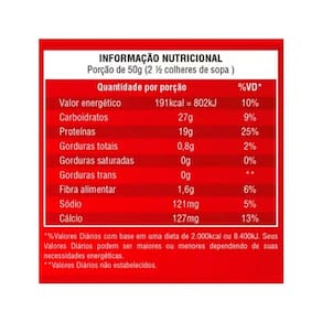 Ingrediente - Baunilha: Proteína concentrada do soro do leite, proteína isolada da soja, matodextrina, soro do leite, espessante foma xantana, aromatizantes, edulcorantes acessulfame de potássio, sucralose e corante allura AC.