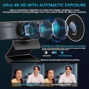-?Microfone estéreo embutido e tecnologia de redução de ruído com cancelamento de eco?A webcam de computador 4K é equipada com microfone omnidirecional embutido de redução de ruído, que pode tornar sua voz clara e filtrar o ruído de fundo. Esta câmera USB Rocware pode oferecer ao seu público um excelente efeito de áudio, tornando-a adequada para muitos campos, como ensino on-line, videochamada, webconferência, captura de retratos, etc.