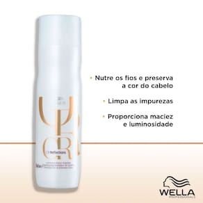 Descrição do Produto: O Wella Oil Reflections Shampoo é um shampoo iluminador que limpa suavemente enquanto nutre e realça o brilho natural dos cabelos. Sua fórmula leve e enriquecida com óleos preciosos proporciona maciez, hidratação e luminosidade incomparável, sem pesar os fios. Ideal para todos os tipos de cabelo, especialmente para quem busca madeixas radiantes e sedosas.