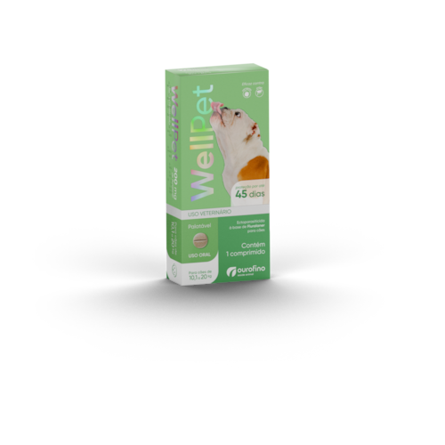 WellPET é um comprimido palatável indicado para o tratamento de infestações causadas pelos ectoparasitas Ctenocephalides felis (pulga) e Rhipicephalus sanguineus (carrapato) em cães mantendo até 45 dias de proteção. Sua fórmula garante ação rápida, ajudando a manter a saúde e o bem-estar dos pets.