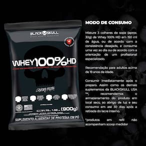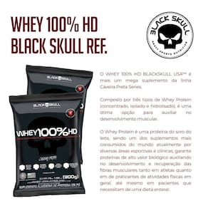 O Whey 100% HD Blackskull USA™ é mais um mega suplemento da linha Caveira Preta Series. Composto por três tipos de Whey Protein (concentrado, isolado e hidrolisado), é uma ótima opção para auxiliar no desenvolvimento muscular. Sua composição conta também com a adição de BCAA (leucina, isoleucina, valina) que são, aminoácidos de cadeia ramificada e contribuem para uma melhor recuperação pós-treino. O Whey Protein é uma proteína do soro do leite, sendo um dos suplementos mais consumidos do mundo atualmente por diversas áreas esportivas e clínicas; garante proteínas de alto valor biológico auxiliando no desenvolvimento e recuperação das fibras musculares tanto em atletas quanto em de praticantes de atividades físicas em geral, até mesmo em pacientes que necessitam de uma dieta enteral.