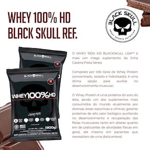 O Whey 100% HD Blackskull USA™ é mais um mega suplemento da linha Caveira Preta Series. Composto por três tipos de Whey Protein (concentrado, isolado e hidrolisado), é uma ótima opção para auxiliar no desenvolvimento muscular. Sua composição conta também com a adição de BCAA (leucina, isoleucina, valina) que são, aminoácidos de cadeia ramificada e contribuem para uma melhor recuperação pós-treino. O Whey Protein é uma proteína do soro do leite, sendo um dos suplementos mais consumidos do mundo atualmente por diversas áreas esportivas e clínicas; garante proteínas de alto valor biológico auxiliando no desenvolvimento e recuperação das fibras musculares tanto em atletas quanto em de praticantes de atividades físicas em geral, até mesmo em pacientes que necessitam de uma dieta enteral.