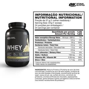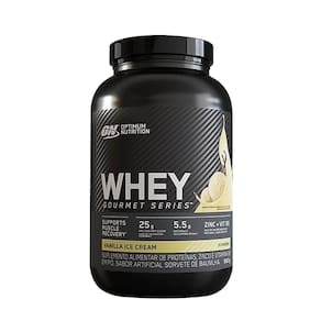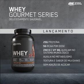 Whey Gourmet Series - 900g - Optimum Nutrition Sabor: Baunilha INGREDIENTES: Mistura Proteica (Protepina de soro de leite concentrada, proteína de soro de leite isolada, proteína de soro de leite hidrolisada, emulsificante lecitina de soja), cacau em pó, sal, sulfao de zinco, cloridato de piridoxina, aromas artificiais de chocolate, espessantes (celulose, goma xantana, e goma carragena) e edulcorantes (sucralose e acessulfame de potássio). Sugestão de uso: dissolver uma medida cheia do scoop medidor (37g) em 180ml de água.