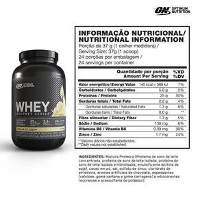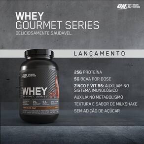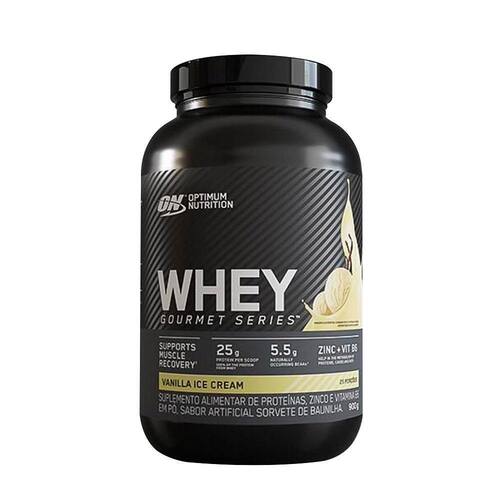 Whey Gourmet Series - 900g - Optimum Nutrition Sabor: Baunilha INGREDIENTES: Mistura Proteica (Protepina de soro de leite concentrada, proteína de soro de leite isolada, proteína de soro de leite hidrolisada, emulsificante lecitina de soja), cacau em pó, sal, sulfao de zinco, cloridato de piridoxina, aromas artificiais de chocolate, espessantes (celulose, goma xantana, e goma carragena) e edulcorantes (sucralose e acessulfame de potássio). Sugestão de uso: dissolver uma medida cheia do scoop medidor (37g) em 180ml de água. Marca: Opttimun Nutrition