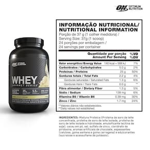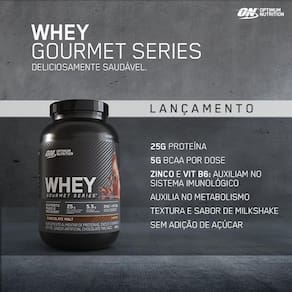 Whey Gourmet Series - 900g - Optimum Nutrition Sabor: Baunilha INGREDIENTES: Mistura Proteica Protepina de soro de leite concentrada, proteína de soro de leite isolada, proteína de soro de leite hidrolisada, emulsificante lecitina de soja , cacau em pó, sal, sulfao de zinco, cloridato de piridoxina, aromas artificiais de chocolate, espessantes celulose, goma xantana, e goma carragena e edulcorantes sucralose e acessulfame de potássio . Sugestão de uso: dissolver uma medida cheia do scoop medidor 37g em 180ml de água. Marca: Opttimun Nutrition